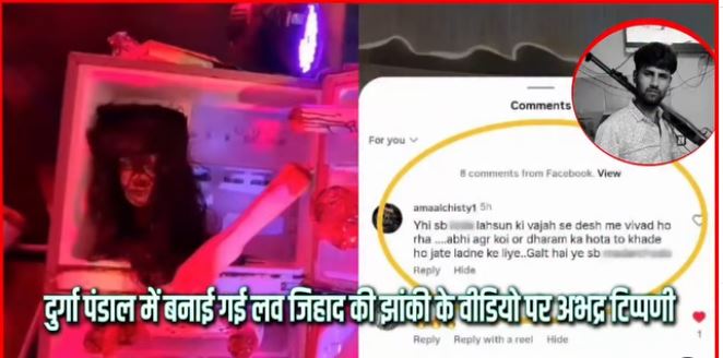 जबलपुर: जिले में लव जिहाद की थीम पर दुर्गा पंडाल बनाया गया था। इसे सोशल मीडिया पर पोस्ट जागरूकता फैला जा रहा है। सोशल मीडिया पोस्ट पर विशेष समुदाय के शख्स ने आपत्तिजनक टिप्पणी की है। इस पर हिंदूवादी संगठनों ने पुलिस में शिकायत दर्ज कराई है। पुलिस ने मामला दर्ज कर लिया है। दरअसल, जबलपुर के जयप्रकाश दुर्गा उत्सव समिति ने लव जिहाद पर दुर्गा पंडाल बनाया है। जिसका वीडियो अधारताल निवासी अनूप पटेल ने सोशल मीडिया पर अपलोड किया है। उस पर लिखा है कि इस बार नवरात्रि के अवसर पर समिति के द्वारा लव जिहाद के संबंध में जागरूकता का संदेश देने के उद्देश्य से दुर्गा पंडाल बनाया गया था। इस वीडियो पर अरबाज अली नामक युवक ने अभद्र टिप्पणी की है।